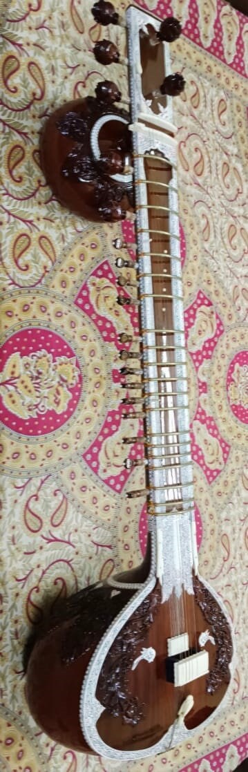 The sitar is an Indian Classical musical instrument, which has a long hollow neck with movable frets & resonating gourd body. The sitar has 18 to 21 strings, of these, seven strings are played with the fingers while the rest are drone and sympathetic strings.
