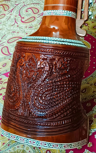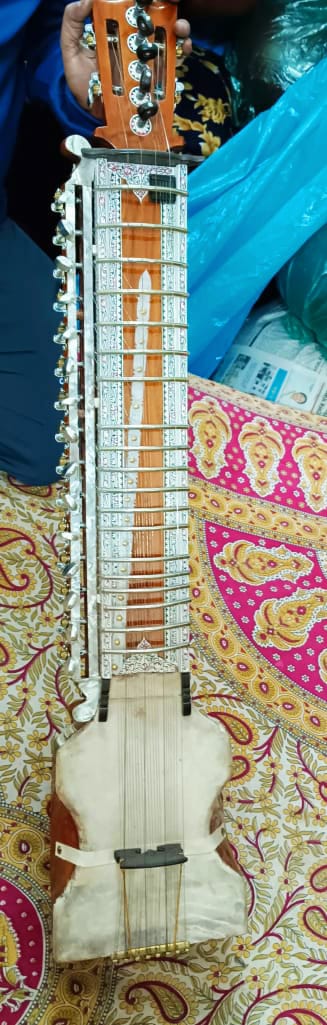 The instrument can be rested between or on the knees while the player kneels, or on the floor just in front of the player, with the neck of the instrument leaning on the left shoulder of the player. It is played using a bow in the right hand, with the other hand moving along the strings above the frets longitudinally. The player may slide the note up or down to achieve the portamento, or meend, as is characteristic of Indian music.