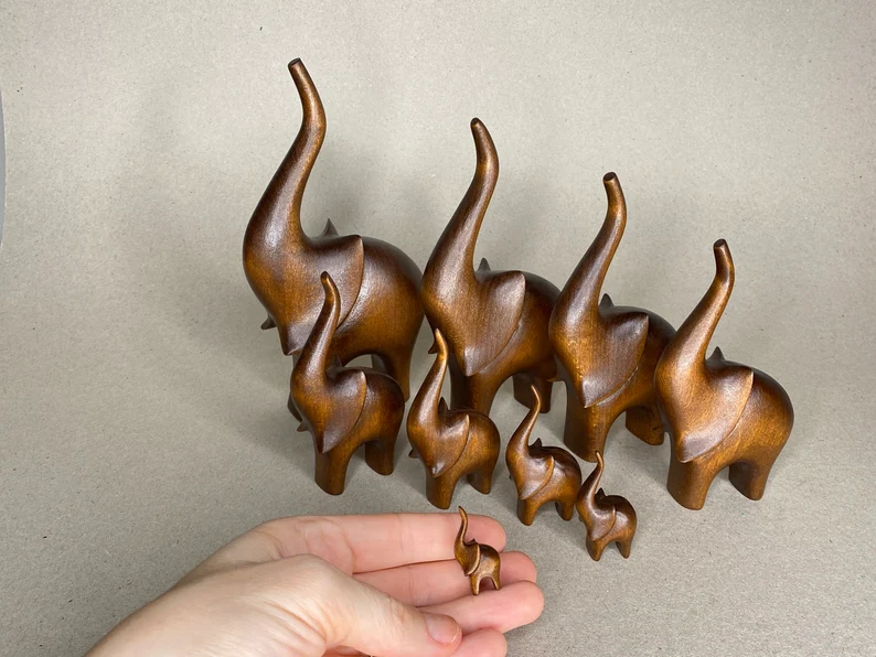 Handcarved Linden Wood Elephant Family Set, Lucky Decor